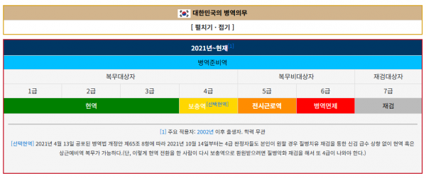 4] 제2국민역=>2016년11월30일 이후로 병역법 제5조에 의해서 "전시근로역"으로 칭한다