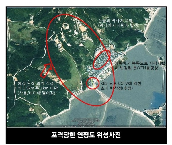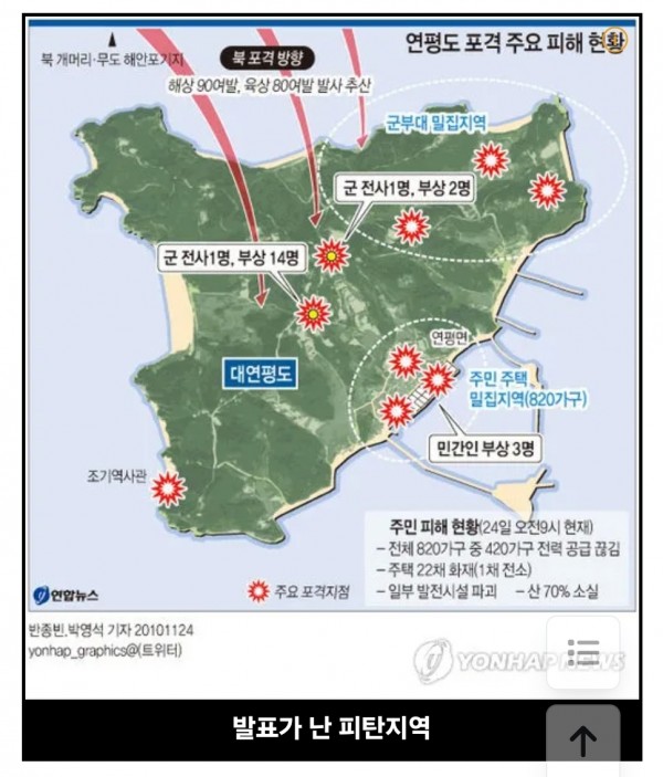 7] 북한은 약 122미리 방사포. 76.2미리 해안포 등 170발 중에서 절반은 연평도에 절반은 바다로 떨어졌다